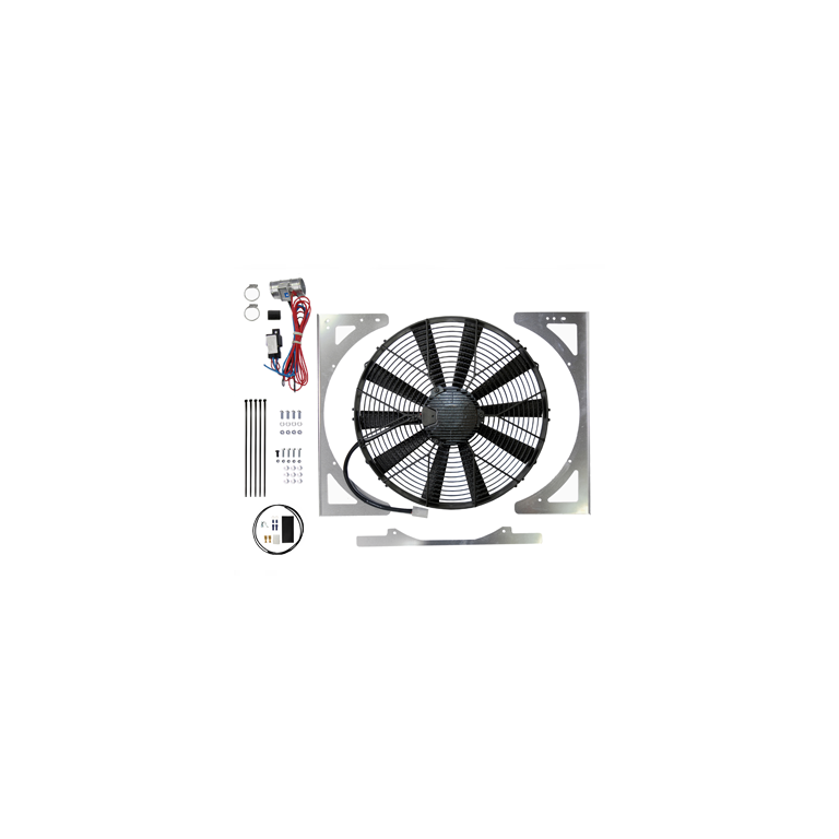 15.2" High Power Suction fan, Laser cut aluminium fan mounting brackets, 35mm Revotec Electronic fan controller designed for Land Rovers with an extended loom, Earth wire kit, Bolts & fittings.