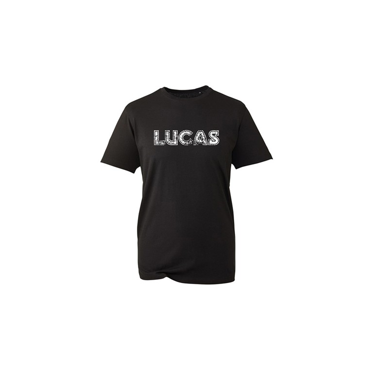 Lucas Distressed T-Shirt Lucas distressed DTG printed t-shirt. Black in size 3 Xtra Large. Fashion fit. Ribbed collar. Taped neck. Side seams. Twin needle stitching.100% organic combed ringspun cotton. 145gsm.