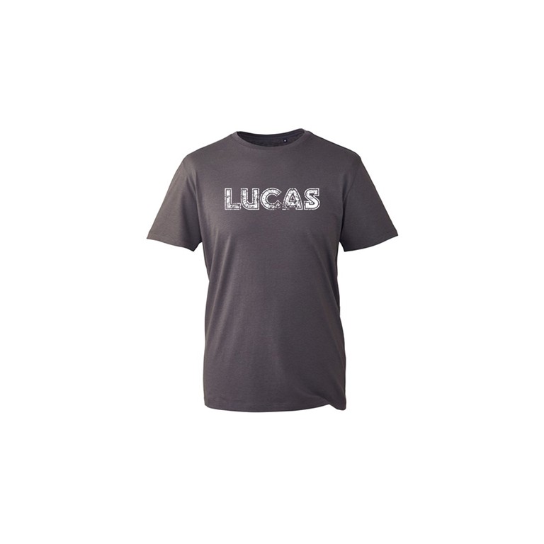 Lucas Distressed T-Shirt Lucas distressed DTG printed t-shirt. Charcoal in size 3 Xtra Large. Fashion fit. Ribbed collar. Taped neck. Side seams. Twin needle stitching.100% organic combed ringspun cotton. 145gsm.