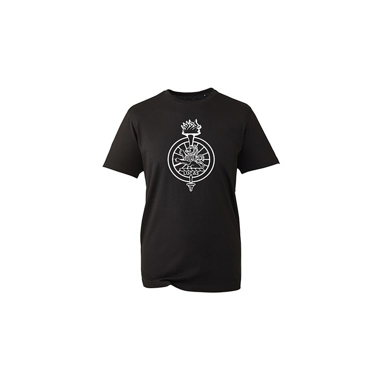 Lucas Flambeau T-Shirt Lucas flambeau DTG printed t-shirt. Black in size 3 Xtra Large. Fashion fit. Ribbed collar. Taped neck. Side seams. Twin needle stitching.100% organic combed ringspun cotton. 145gsm.