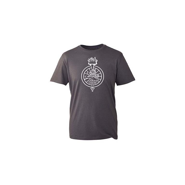 Lucas Flambeau T-Shirt Lucas flambeau DTG printed t-shirt. Charcoal in size 3 Xtra Large. Fashion fit. Ribbed collar. Taped neck. Side seams. Twin needle stitching.100% organic combed ringspun cotton. 145gsm.