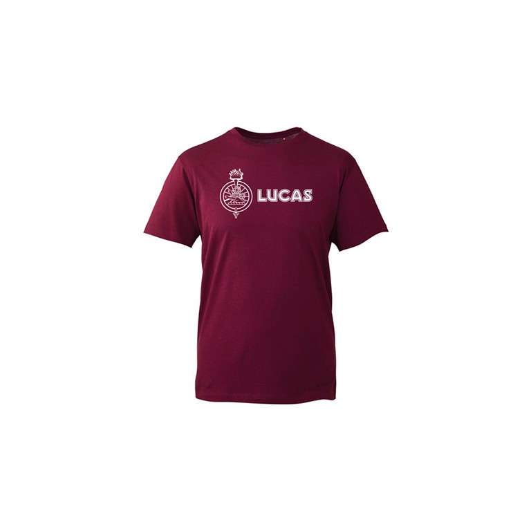 Lucas T-Shirt Lucas DTG printed t-shirt. Burgundy in size 3 Xtra Large. Fashion fit. Ribbed collar. Taped neck. Side seams. Twin needle stitching.100% organic combed ringspun cotton. 145gsm.