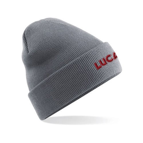 Lucas Text Cuffed Beanie in Graphite Embroidered front with Lucas text logo. Double layer knit. Cuffed design for optimal decoration. Machine wash warm iron on low heat. 72g weight. 100% soft-touch acrylic.