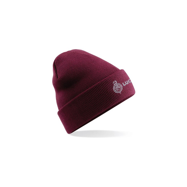 Lucas Text Cuffed Beanie in Burgundy Embroidered front with Lucas logo. Double layer knit. Cuffed design for optimal decoration. Machine wash warm iron on low heat. 72g weight. 100% soft-touch acrylic.