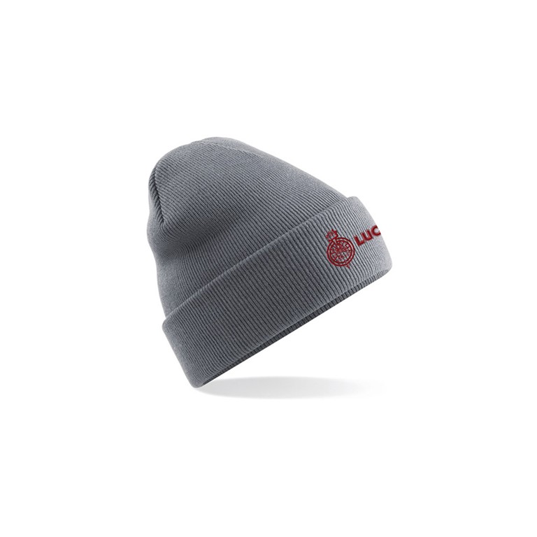 Lucas Text Cuffed Beanie in Graphite Embroidered front with Lucas logo. Double layer knit. Cuffed design for optimal decoration. Machine wash warm iron on low heat. 72g weight. 100% soft-touch acrylic.