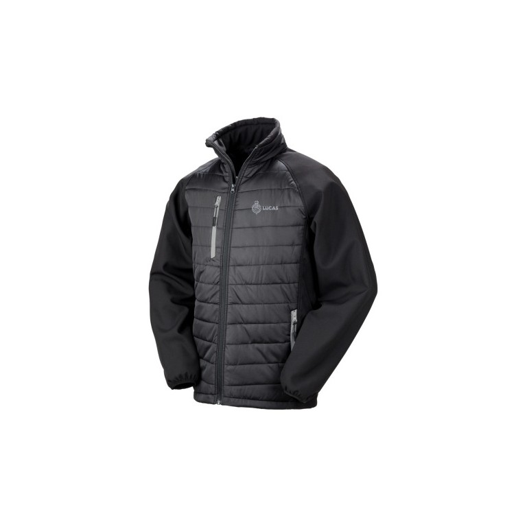 Lucas Logo Padded Softshell Jacket Lucas logo embroidered to left chest. Black/Grey in size Large. Showerproof windproof and breathable. Contrast colour pocket zips. YKK Full front zip with chin guard. Stand-up padded collar. Padded body. Soft bound cuff. Black zip pulls. Hangtag. REPREVE® performance recycled padding using environmental-friendly materials made from recycled plastic bottles and post-industrial waste offering a sustainable equivalent to conventional yarns. TOPGREEN® environmental-friendly softshell polyester printable sleeves. 280gsm material. 100% polyester.