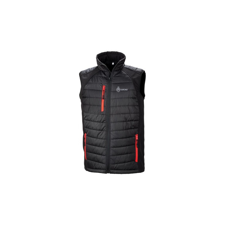 Lucas Logo Padded Softshell Gilet Lucas logo embroidered to left chest. Black/Red in size Large. YKK front zip with chin guard. Contrast colour pocket zips. Stand-up padded collar. Black zip pulls. Padded body. Hang loop. REPREVE® performance recycled padding using environmental-friendly materials made from recycled plastic bottles and post-industrial waste offering a sustainable equivalent to conventional yarns. TOPGREEN® environmental-friendly softshell polyester. JAIREN recycled waste and scrap material usage. Both recycled plastic and fabric waste used for this style. 280gsm material. 100% polyester