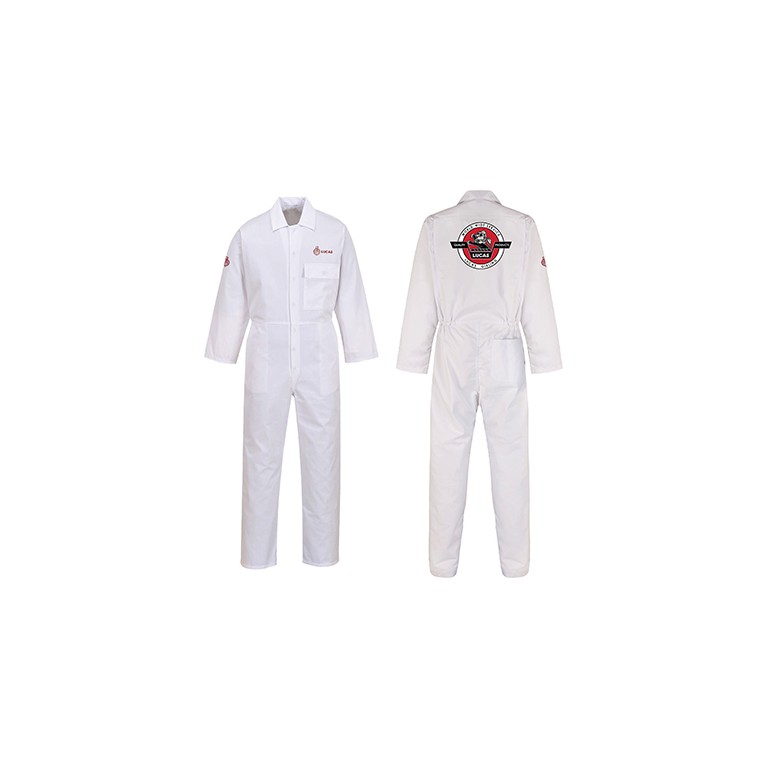 Lucas Coverall White in size Large. Embroidered with the Lucas logo to the left chest Lucas Flambeau to the right sleeve and Lucas Lion patch to the back. This smart coverall features a chest pocket with flap for secure storage and two side pockets. Comfort practicality and durability are ensured. Non shrinking to ensure that this style maintains its shape wash after wash. Concealed stud front for easy access. Quick and easy side access. 4 pockets for ample storage .Rule pocket. Side pockets. Half elasticated waist for a secure and comfortable fit. Bartacked at all stress points. 40+ UPF rated fabric to block 98% of UV rays. 65% Polyester 35% Cotton 245g.