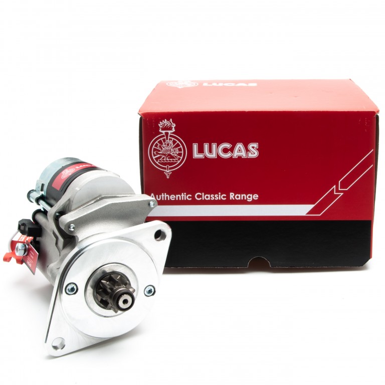 Lucas up-rated, lightweight starter motor, fits MGA, early MGB, MGTD / TF (with 120 teeth ring gear), Bristol 6 cyl, Sunbeam Alpine, and Triumph Herald. 9 toothed gear.