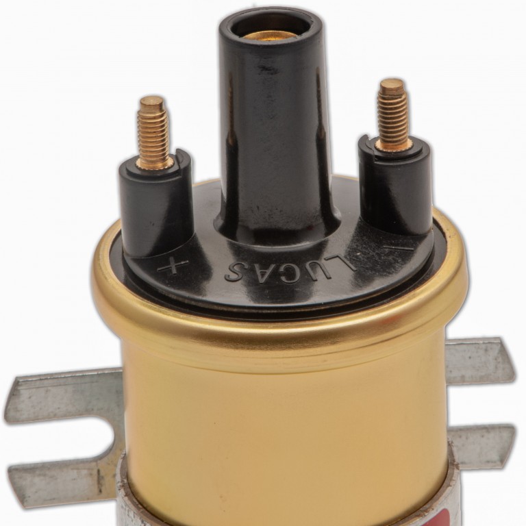 High output 12 volt Lucas Sports coil with a push-in center lead. Supplied with the mounting bracket and ready to fit. Wires attached via 5mm ring terminals, or adaptors (included) to take Lucar terminals.
