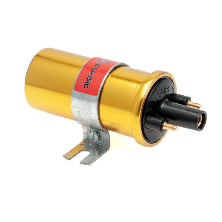 High output 12 volt Lucas Sports coil for use with a ballast resistor. This coil has a push-in centre lead. Supplied with the mounting bracket and is ready to fit. Wires attached via 5mm ring terminals, or adaptors (included) to take Lucar terminals Primary coil resistance 1.5 ohms and secondary coil resistance 8.6 k/ohms. DLB110.