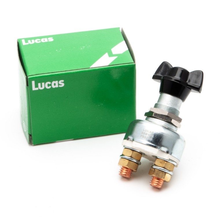 An original Lucas Battery Master Switch with a fixed, winged knob. Requires hole size 19.5 mm diameter. Rated for continuous loads of up to 150 amps and intermittent loads of 1500 amps on 12 volt systems. Lucas SSB106 or 76606. This is for use on the EARTH TERMINAL ONLY