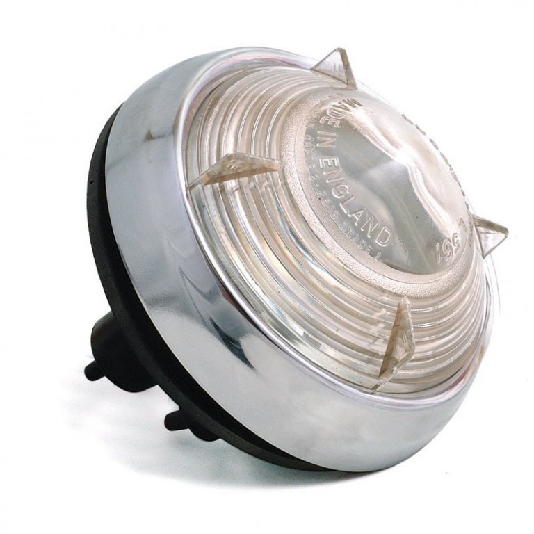 This is a quality reproduction of the Lucas original, made with two separate bulbs. One for could be used as a side lamp and one for flasher (An amber single contact 21W bulb is available). Equally, the lamp could be used as a reversing lamp by only connecting the main bulb. (Please note that lamps of the original Lucas manufacture had a single double contact bulb, this means that although this complete lamp is interchangeable with an original, the component parts of the base are not interchangeable with an original).