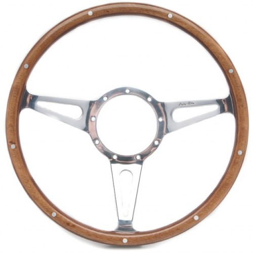 The original classic British wood rim Steering Wheel by Moto-Lita. Hand built from selected cross-laminated wood which is bonded and riveted to a one piece, heavy gauge, hand polished, aluminium alloy frame. The underside of the rim has 36 hand carved finger notches. The rim is finished in a hard wearing deep lustre resistant to petrol, oil and the elements. This one is dished, but a flat version is also available, This pattern of wheel is only stocked in 14 and 15 inch diameter. A range of bosses to suit different applications is available to purchase separately.
