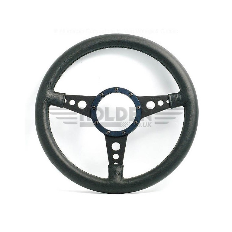 The classic British leather rim Steering Wheel by Moto-Lita. Made from top quality black leather handsewn over a natural rubber handgrip, with each spoke having an integral soft padded thumb grip. The traditionally drilled aluminium alloy spokes are anodised matt black. This one is flat, for dished refer to 090.078. You will also need a boss refer to 'Steering Wheel Bosses etc.'