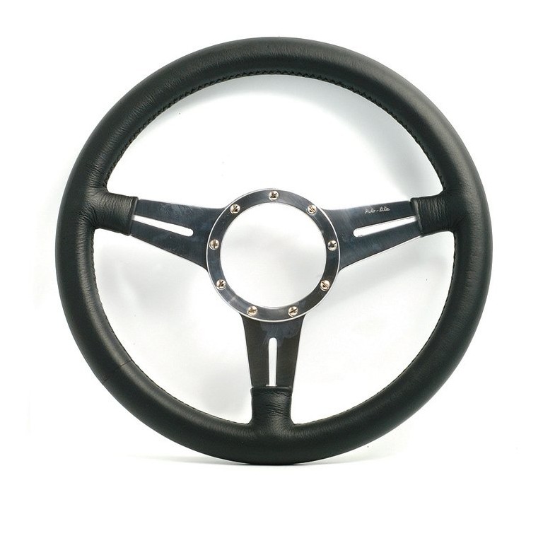 The classic British leather rim Steering Wheel by Moto-Lita. Made from top quality black leather handsewn over a natural rubber handgrip, with each spoke having an integral soft padded thumb grip. The aluminium alloy spokes are thinly slotted and polished. You will also need a boss refer to 'Steering Wheel Bosses etc.'
