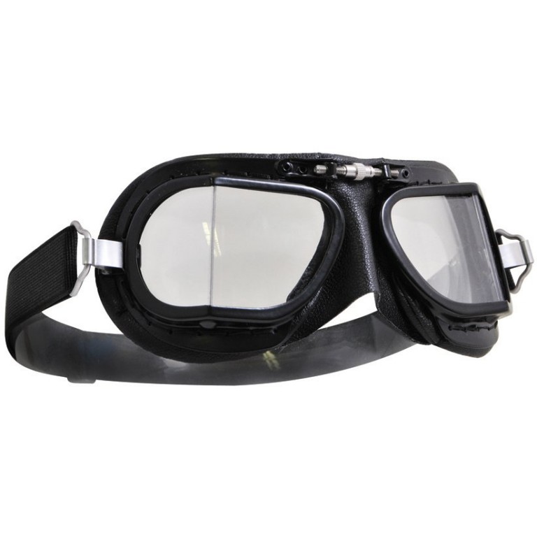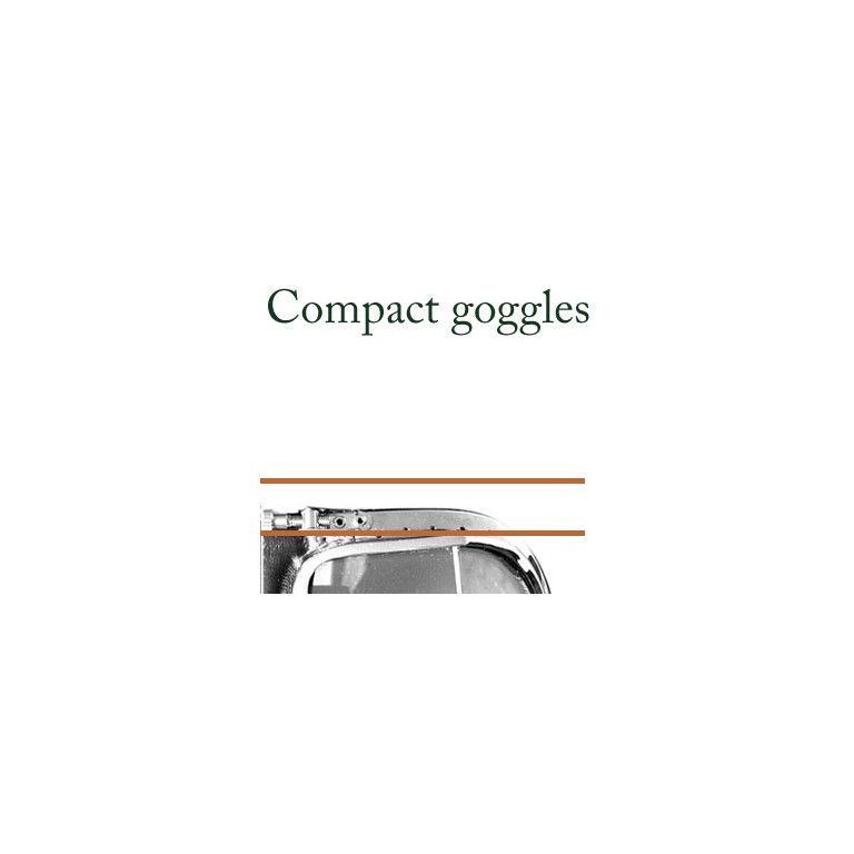 Over time crash helmets have become more padded and many now have limited space to comfortably wear a pair of goggles. The black painted frames of this Compact version of the Mark 9 styled goggles are reduced in height by 5mm and have louvres to prevent misting and knurled screw nose bridge adjustment. The thin padding, covered with hand stitched black PVC, has been shaped to fit under the more modern helmets. Quality elasticated coloured headband with snap-on clips. Moulded and coated polycarbonate replaceable lenses tested to BS EN138. Supplied with an Instruction Leaflet