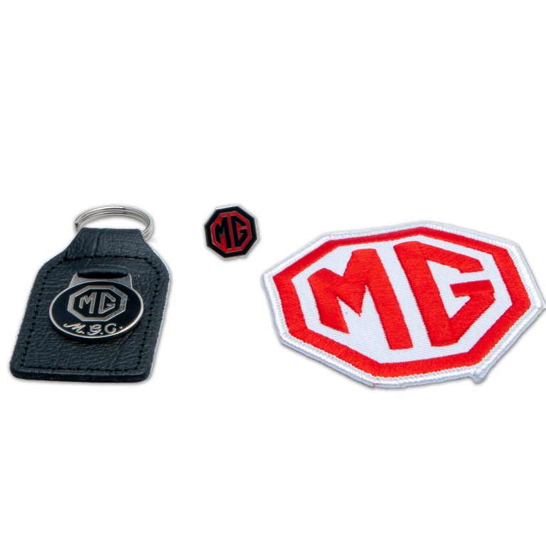 Badge set for MGC. Comprises a leather key fob with an enamelled badge, enamelled lapel badge and an embroidered badge for overalls, jacket or cap.