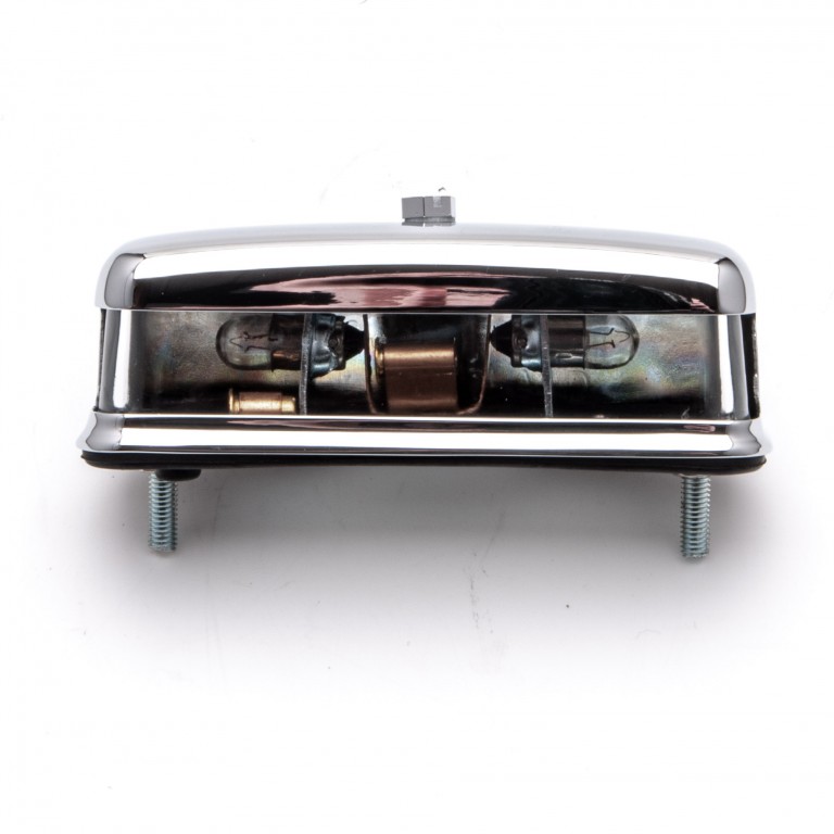 An accurate reproduction of the Lucas number plate lamp L467 that has been used in many applications from the 1950s onwards. Mounted to a flat surface via bolts on the rear. Polished chrome cover over a glass lens. Measures 110 x 45mm. Backing gasket included. Supplied with bulbs. A mounting bracket is also available if required. L467 or 56790 ACU2344, BHA4153
