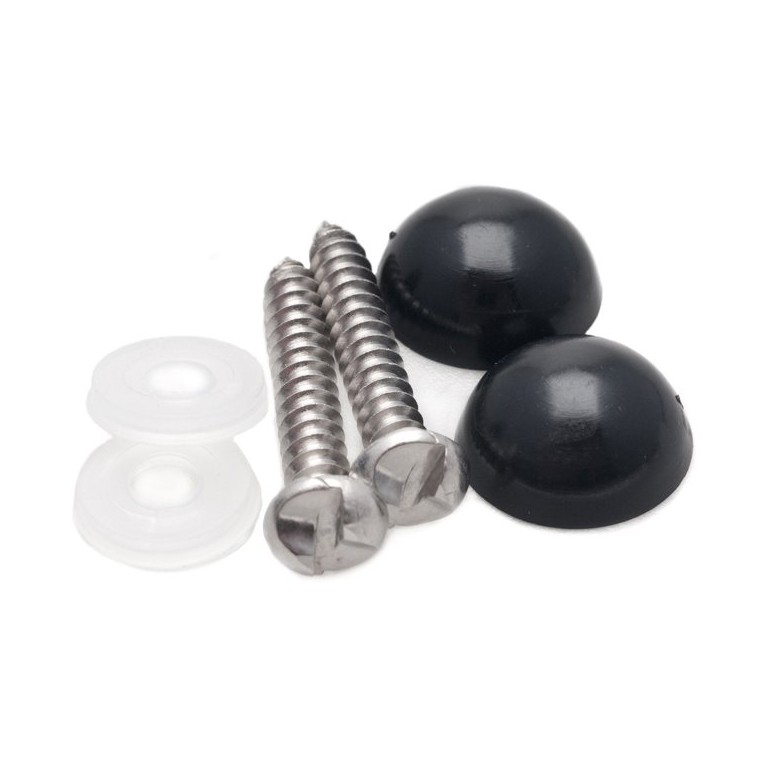 Two self tapping screws and black plastic caps for attaching metal or plastic number plates to your car so that the screw heads do not show up