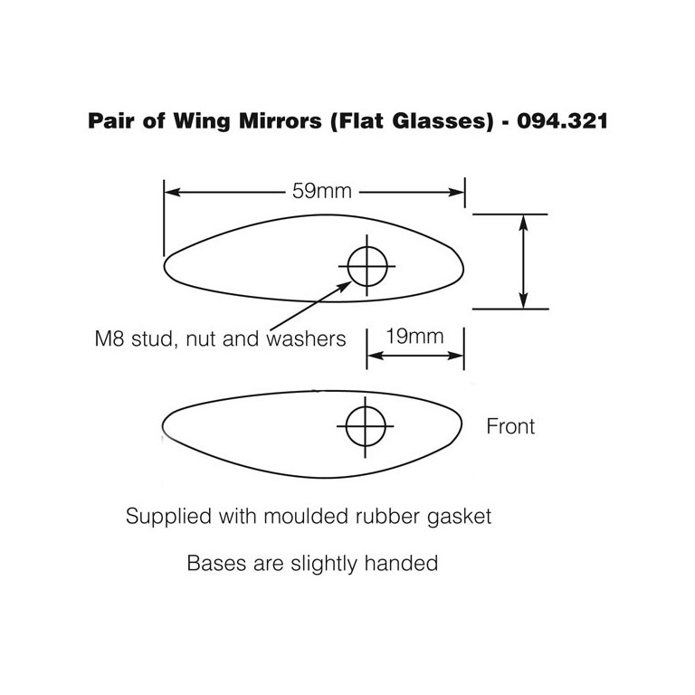 Convex glass mirror of 110mm diameter, looking similar to the Lucas 406 type, but not having the visible clamp on the rear of the mirror head. Single stud fixing and supplied with the base rubber