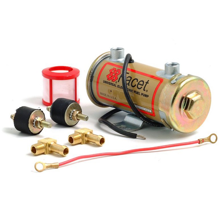 Facet Red top pump for engines over 200 b.h.p. used for competition. 12v negative earth, 40 (US) gallons per hour (which equates to 33 (UK) gallons per hour) at 6.0 to 8.0 p.s.i., requires 8mm diameter fuel line. Size 135 x 50mm. The kit includes two right-angled fittings which are 1/4 NPTF, Facet mounting bobbins and a spare filter to fit inside the pump.