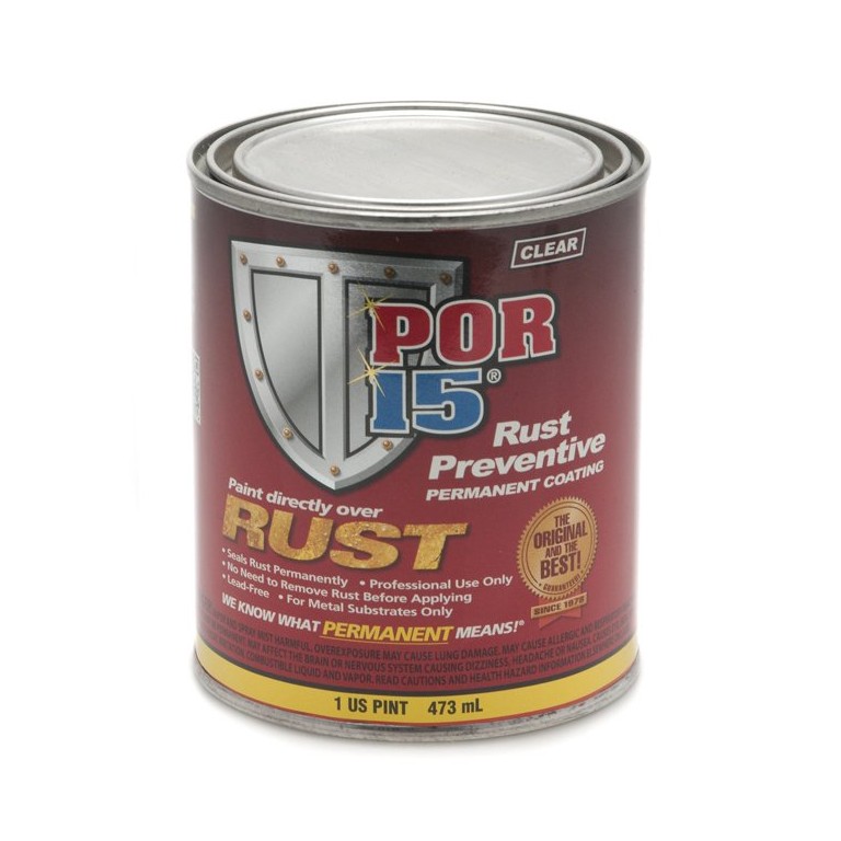 POR-15 Rust Preventive Paint is a high-tech, high performance rust-preventive coating designed for application directly on rusted or seasoned metal surfaces. It dries to an incredible rock-hard, non-porous finish that won't chip, crack, or peel, and it prevents rust from recurring by protecting metal from further exposure to moisture. Use it to coat rusty frames, floor pans, farm equipment, marine equipment, heavily corroded battery trays and can be used also to paint concrete floors. POR-15 Rust Preventive Paint is sensitive to UV light (sun) and must be topcoated for prolonged exposure to sunlight. Topcoating is not required for areas not exposed to sunlight. This particular paint is clear