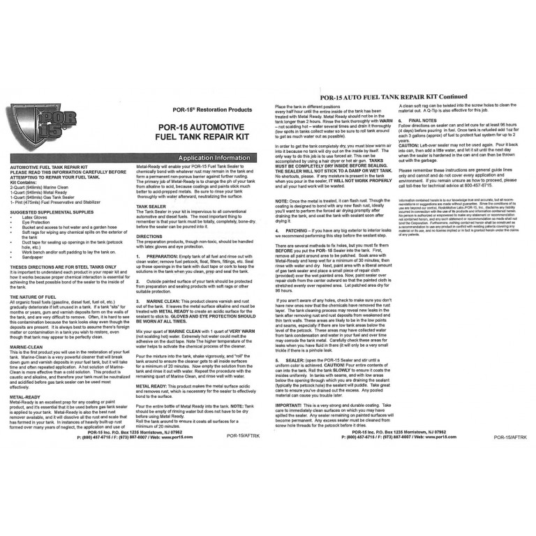 POR-15 U.S. Standard Fuel Tank Sealer was formulated and developed by POR-15 due to the demand for a high-tech sealer impervious to all fuels, including the new Stage II fuels which have high alcohol content. It has superior strength and fuel resistance and does not contain Methyl Ethyl Ketone.