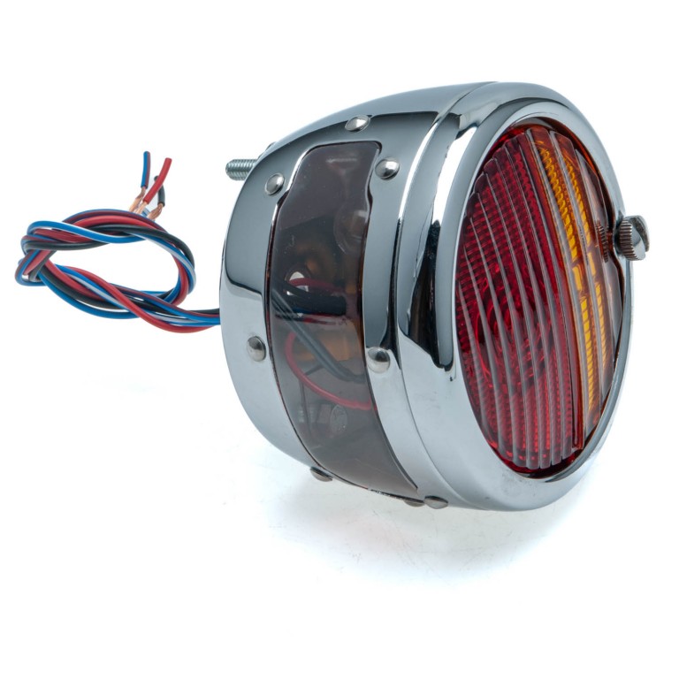 This is a quality reproduction providing a rear lamp, brake lamp and numberplate lamp, with internal modification to accomodate an extra bulb to provide a flasher facility and a dual colour red and amber lens.