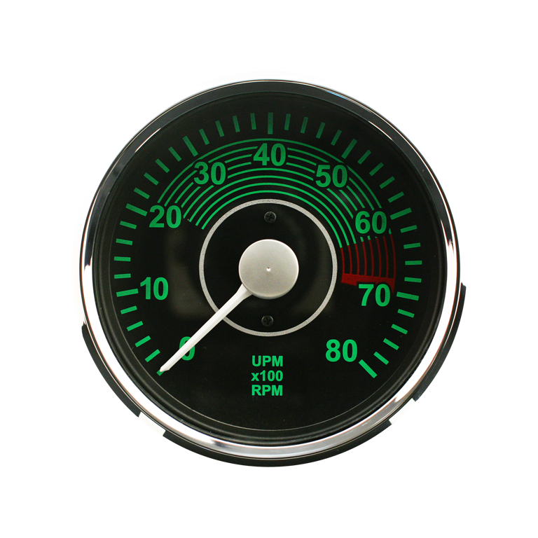 100mm programmable 8K tachometer with black dial, green print and white pointer. Full V chrome bezel.