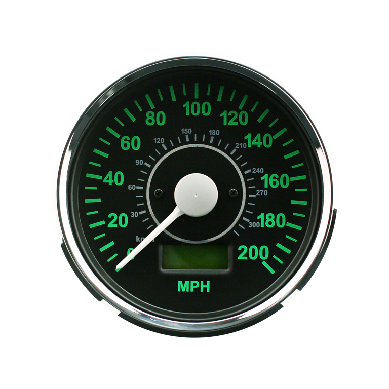 100mm Stepper Speedometer 0-200 MPH. Black dial with green print and grey inner kmh scale. Full V chrome bezel.