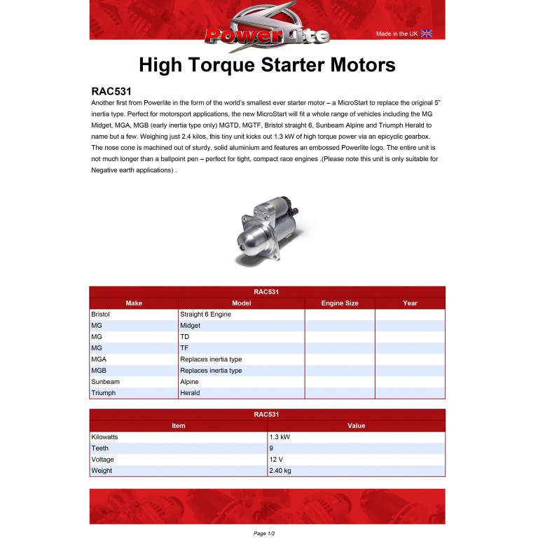 a MicroStart to replace the original 5 inertia type. Perfect for motorsport applications, the new MicroStart will fit a whole range of vehicles including the MG Midget, MGA, MGB (early inertia type only) MGTD, MGTF, Bristol straight 6, Sunbeam Alpine, and Triumph Herald to name but a few. Weighing just 2.4 kilos, this tiny unit kicks out 1.3 kW of high torque power via an epicyclic gearbox. The nose cone is machined out of sturdy, solid aluminum and features an embossed Powerlite logo. The entire unit is not much longer than a ballpoint pen – perfect for tight, compact race engines. (Please note this unit is only suitable for Negative earth applications) .