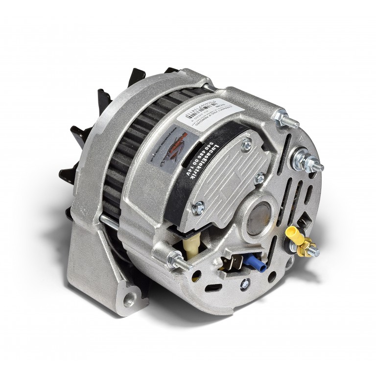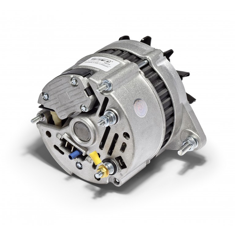 Heavy-duty replacement for the original Lucas 11AC alternator with a right hand mounting. This brand new unit produces 80 amps and has a built-in regulator.