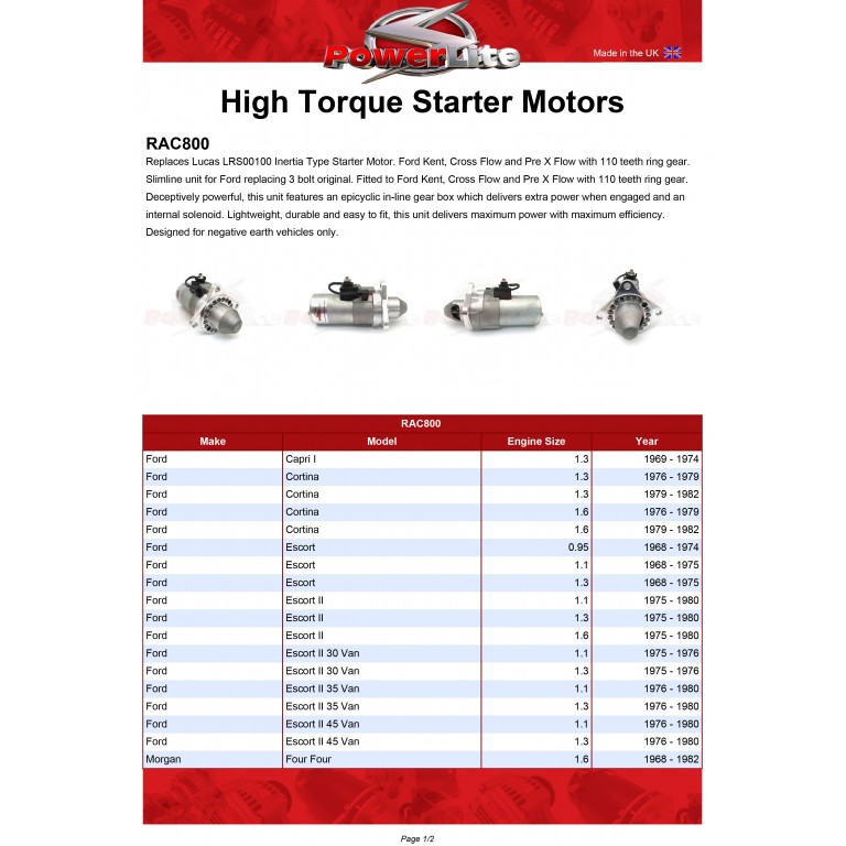 Powerlite Slimline gear reduction starter motor designed specifically to fit Ford Crossflow and Pre-Crossflow engines with 110 teeth ring gear. This unit is a direct replacement for the Lucas 3 hole inertia starter motor ref LRS100
