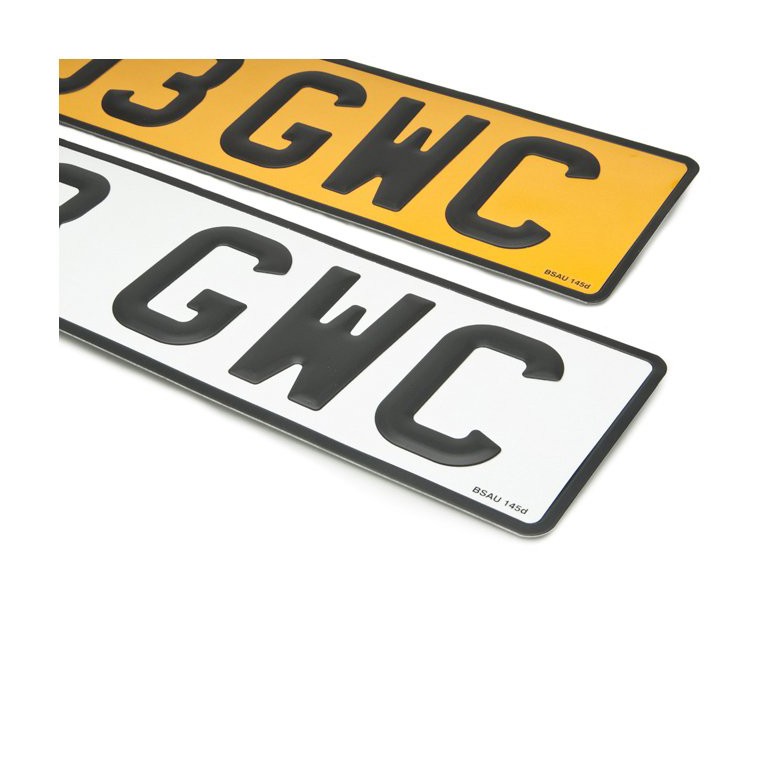 Pressed aluminium number plates with black characters and edge on a white or yellow background. 80mm (3 1/8 in) digits. This part number covers a pair of oblong plates 520mm x 114mm (20.5 in x 4.5 in), one white and one yellow (amber). Regulations for UK delivery demand that you provide us with your original V5C registration document and proof of identity (Driving licence/A utility or Council Tax bill in your name.