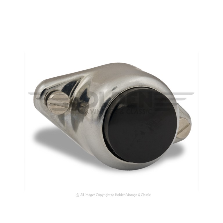 Black button with chrome surround. Mounts on surface of panel, can be wired through panel or wire run down front of panel. Two hole fixing using screws/nuts supplied. Can be used for horn button or starter solenoid. Width 55mm x height 31mm. Stands out 22mm from panel.