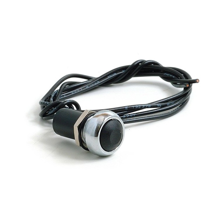 A small Push Button Switch, only 17.5 mm overall diameter, requiring a 13.6 mm diameter hole in the panel. Black button with chromed surround. Supplied with two wires for connection to your vehicle electrics. Rated at 0.8 amps on 12 volt systems. You may need to use a relay with this switch