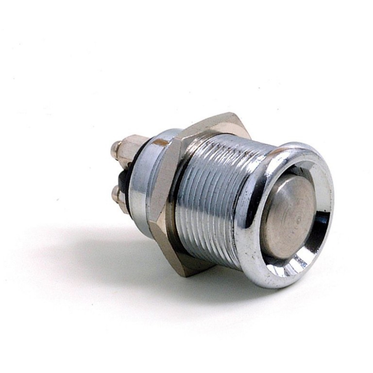 A Push Button Switch with stainless steel button and nickel plated brass body. Rated at 6 amps on 12 volt systems. 22mm diameter requiring a 19 mm diameter hole in the panel. Long thread so that it can be used on metal or wood panels up to 15 mm thick. Fits almost flush with the panel. Screw connections at rear