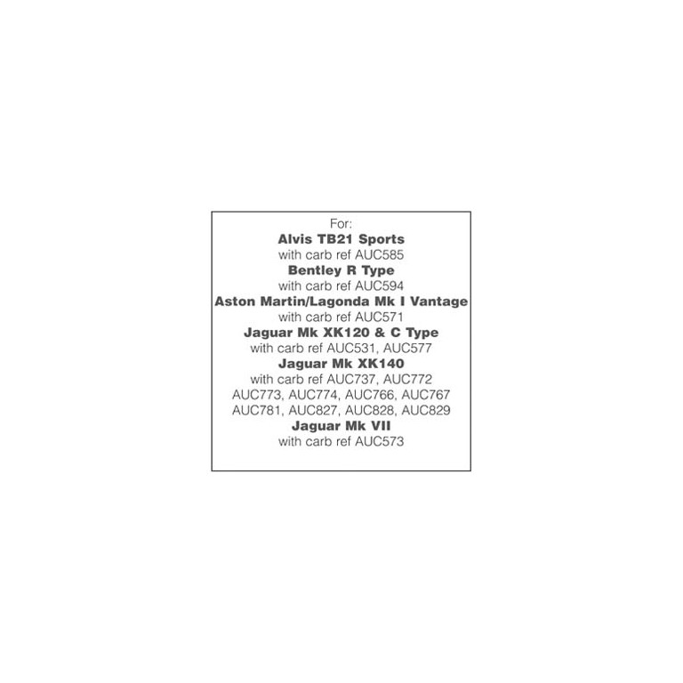 Contains new jet, float valve, all gaskets and seals, throttle disc and screws, spindle and spindle bushes to rebuild one SU carburettor on your Alvis TB21 Sports 1952, Bentley R Type 1952-54, Aston Martin Lagonda Mk I Vantage 1951-53, Jaguar XK120 & C Type 1949-54, XK140 1954-56, Mk VII 1951-54. Please note, however, that the NEEDLE is not included and should be ordered separately