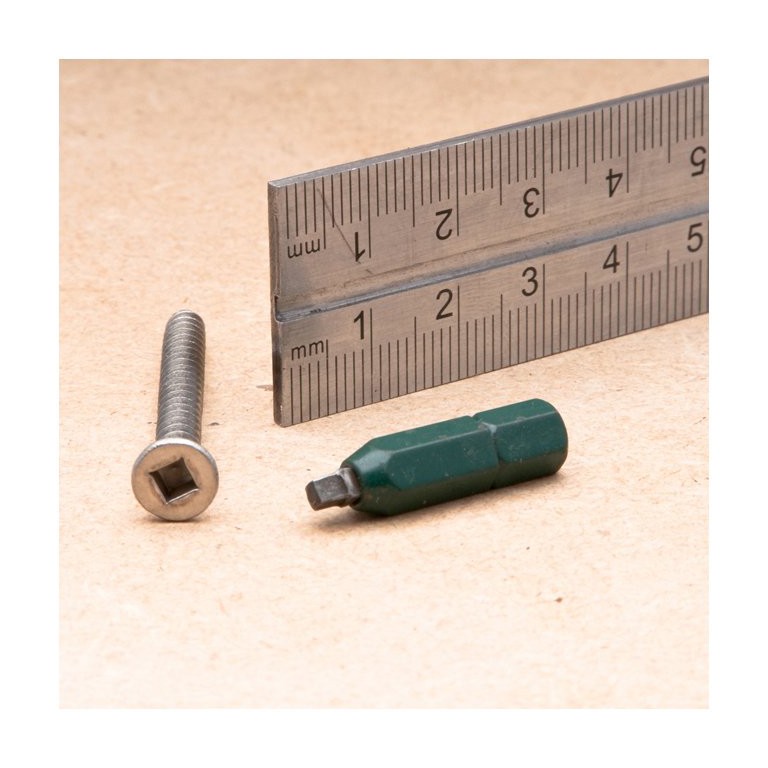 Driver Bit for Robertson No 3.5 and 3.75 woodscrews. 25mm long. Coloured green for identification. The Robertson wood screw has a square-shaped socket in the screw head and a square protrusion on the screwdriver. Both have a taper, which makes inserting the screwdriver easier, and also tends to help keep the screw on the screwdriver tip without the user needing to hold it there. Robertson screwdrivers are easy to use one-handed, because the tapered socket tends to retain the screw, even if it is shaken. For details of Robertson wood screws see under 'Fixings'