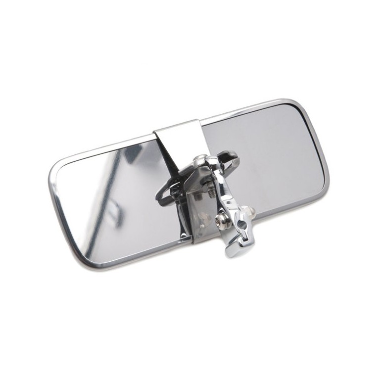Certain sports cars such as the MGB have a vertical rod in the middle of the windscreen to fix an interior mirror to. This is the mirror head that is compatible with rod fixing, made with a chromed backing to the mirror and a chromed bracket. Mirror measures 155mm x 60mm. A mirror of similar style is available in black plastic and gold painted finishes.