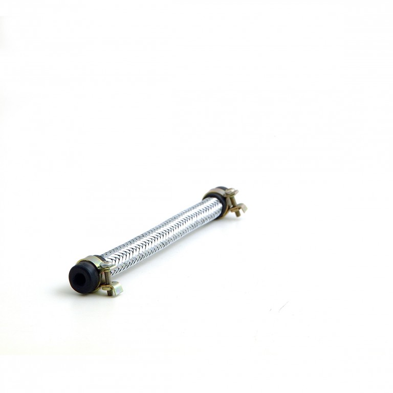 Nitrile rubber with stainless steel overbraided suitable for use with leaded, lead substitute and unleaded petrol. Each end has a rubber fitting secured by a clip. 1/4 pipe (6mm). Length 170mm