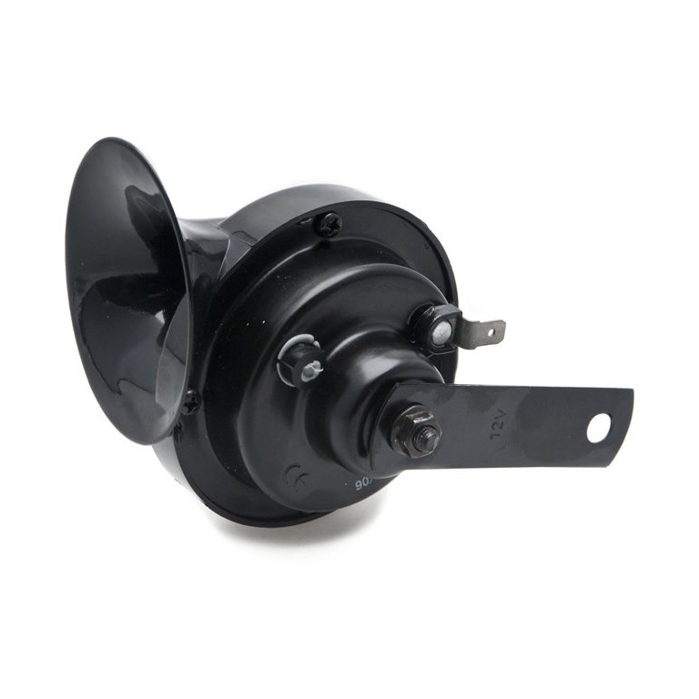 12 volt Single Terminal, black plastic Wind Tone Horn. Low tone or note. Supplied with a mounting bracket set. Electrical connection via single lucar type terminal. A high tone version is also available.