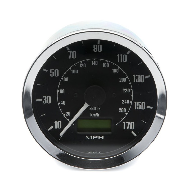 This is a technically advanced instrument with white graphics on a black dial with chrome 1/2 V rim. It is designed to match the other gauges in the Smiths classic range, but it operates electronically from 12 volts (NEGATIVE EARTH ONLY) and is calibrated by you to suit the gearing on your car. It is 100mm diameter, has illumination and reads up to 140 mph. Speed sensors and screened cable are available to purchase separately.