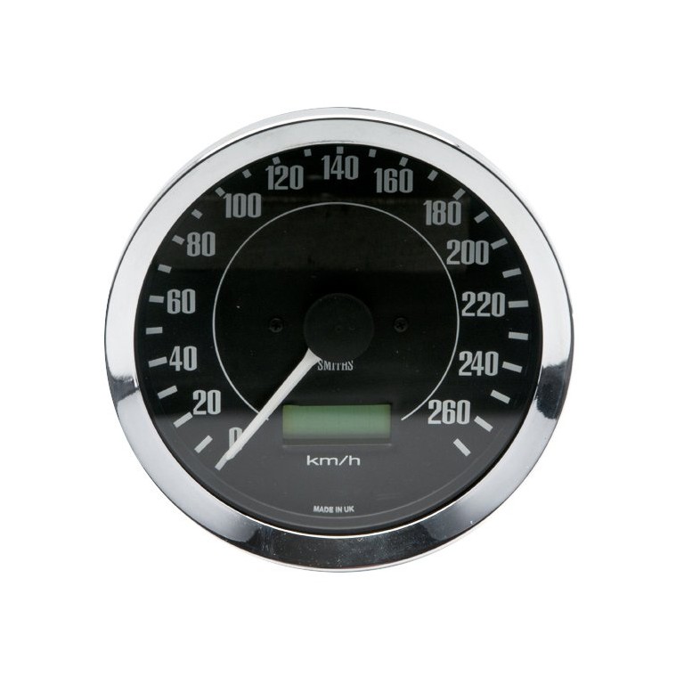 This is a technically advanced instrument with white graphics on a black dial with chrome 1/2 V rim. It is designed to match the other gauges in the Smiths classic range, but it operates electronically from 12 volts (NEGATIVE EARTH ONLY) and is calibrated by you to suit the gearing on your car. It is 100mm diameter, has illumination and reads up to 260 kph. Speed sensors and screened cable are available to purchase separately.