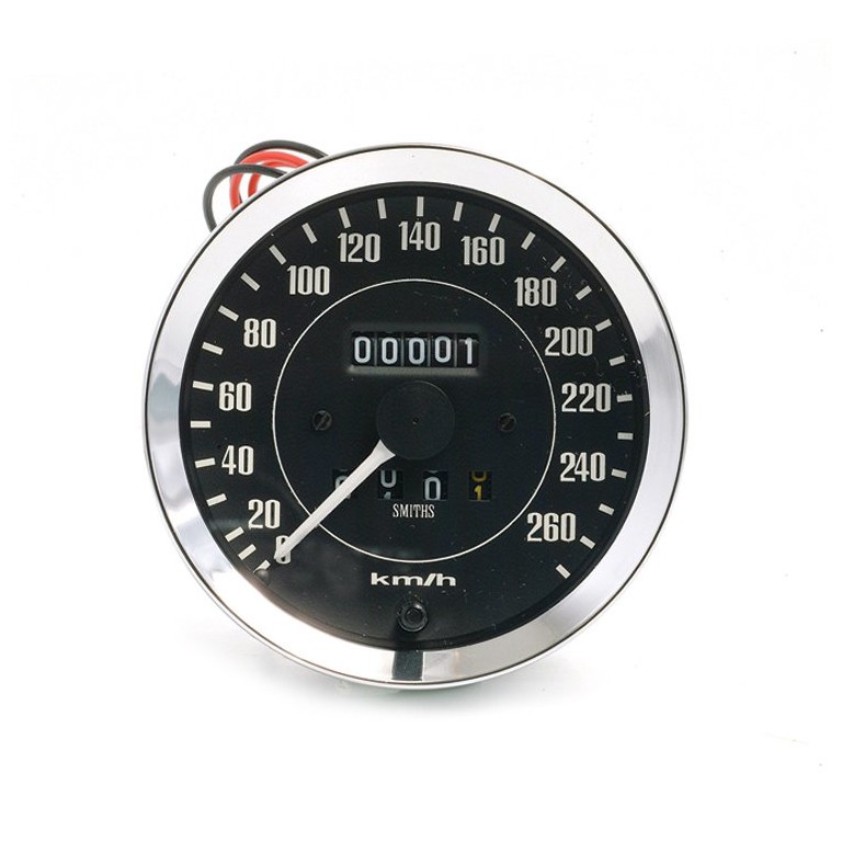 Genuine SMITHS designed instrument, skillfully crafted to the original drawings and specifications, using the original tools and dies. This one is 100 mm diameter with 1/2V chrome bezel, white figures on a black dial reading to 260 kph and trigger cable fitting. (This is a plastic push-on type fitting. You may require a different speedo cable to complete your installation) Supplied with bulb holder and bulb, together with the necessary mounting clamps. Trip reset is via a button on the dial face.
