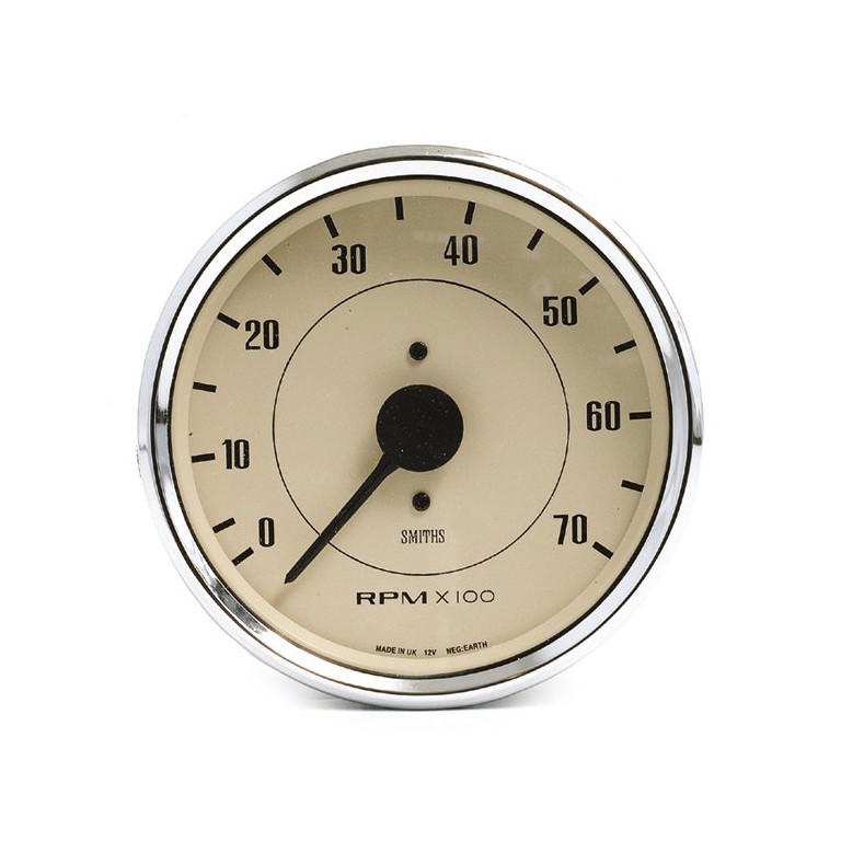 Genuine SMITHS designed instrument, skillfully crafted to the original drawings and specifications, using the original tools and dies. This one is 100mm diameter with full V chrome bezel, black figures on a magnolia dial reading from 0 to 7000 rpm and switchable for 2, 4, 6, 8 and 12 cylinder engines, including 'wasted spark' 2 cylinder engines, for example Citroen 2CV. 12 volt (NEGATIVE EARTH ONLY) electronic operation Supplied with bulb holder and bulb, together with the necessary mounting clamps. Full instructions for setup are included.