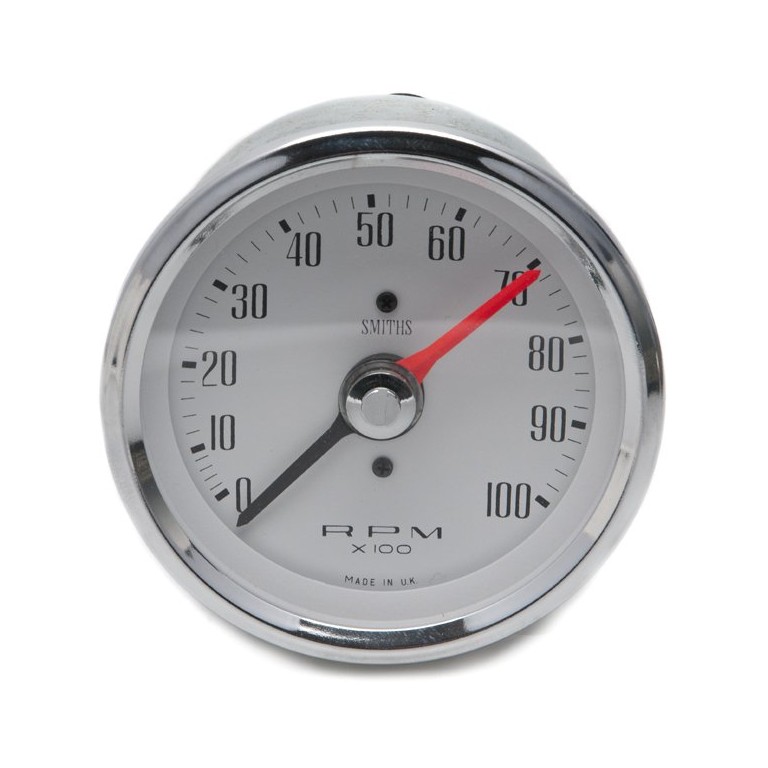 This Tachometer has an additional hand with which you can mark the maximum rpm. you wish to use on any particular journey or event. Popular for competition work. Switchable for 2, 4, 6, 8 and 12 cylinder engines, including 'wasted spark' 2 cylinder engines, for example Citroen 2CV. This one is 80 mm diameter with Full V chrome bezel, black figures on a Magnolia dial reading to 8,000rpm. 12 volt (NEGATIVE EARTH ONLY) electronic operation and supplied with bulb holder and bulb, together with the necessary mounting clamps