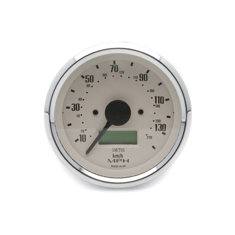 This is a technically advanced instrument with black graphics on a magnolia dial with chrome full V rim. It is designed to match the other gauges in the Smiths classic range, but it operates electronically from 12 volts (NEGATIVE EARTH ONLY) and is calibrated by you to suit the gearing on your car. It is 80mm diameter, has illumination and reads up to 140 mph. Speed sensors and screened cable are available to purchase separately.
