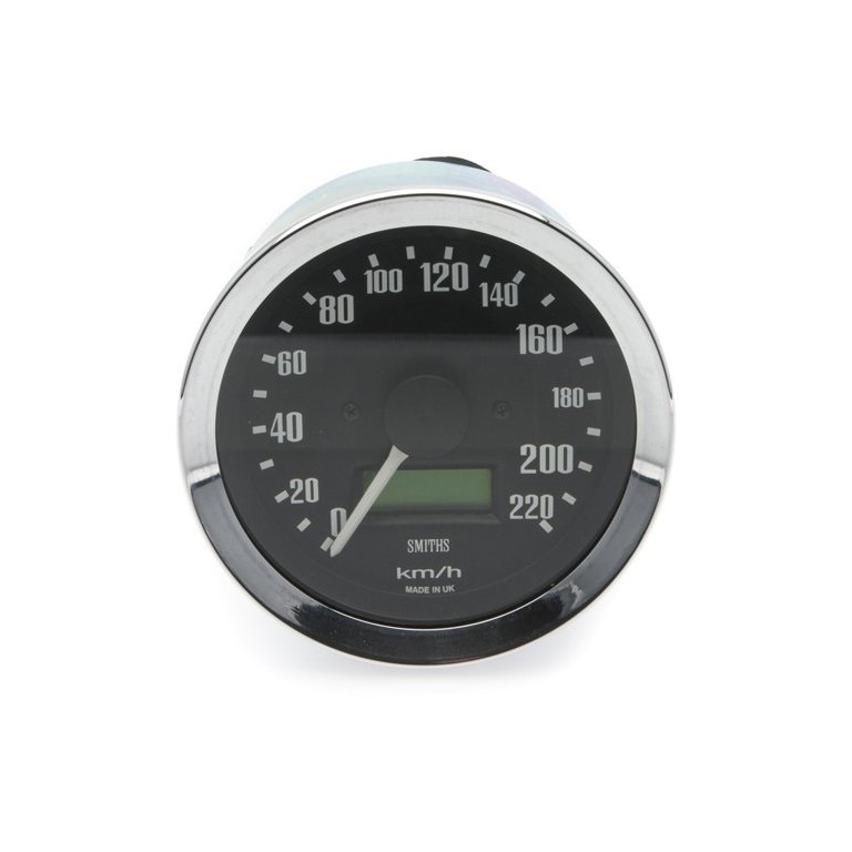 This is a technically advanced instrument with white graphics on a black dial with chrome 1/2 V rim. It is designed to match the other gauges in the Smiths classic range, but it operates electronically from 12 volts (NEGATIVE EARTH ONLY) and is calibrated by you to suit the gearing on your car. It is 80mm diameter, has illumination and reads up to 220 kph. Speed sensors and screened cable are available to purchase separately.